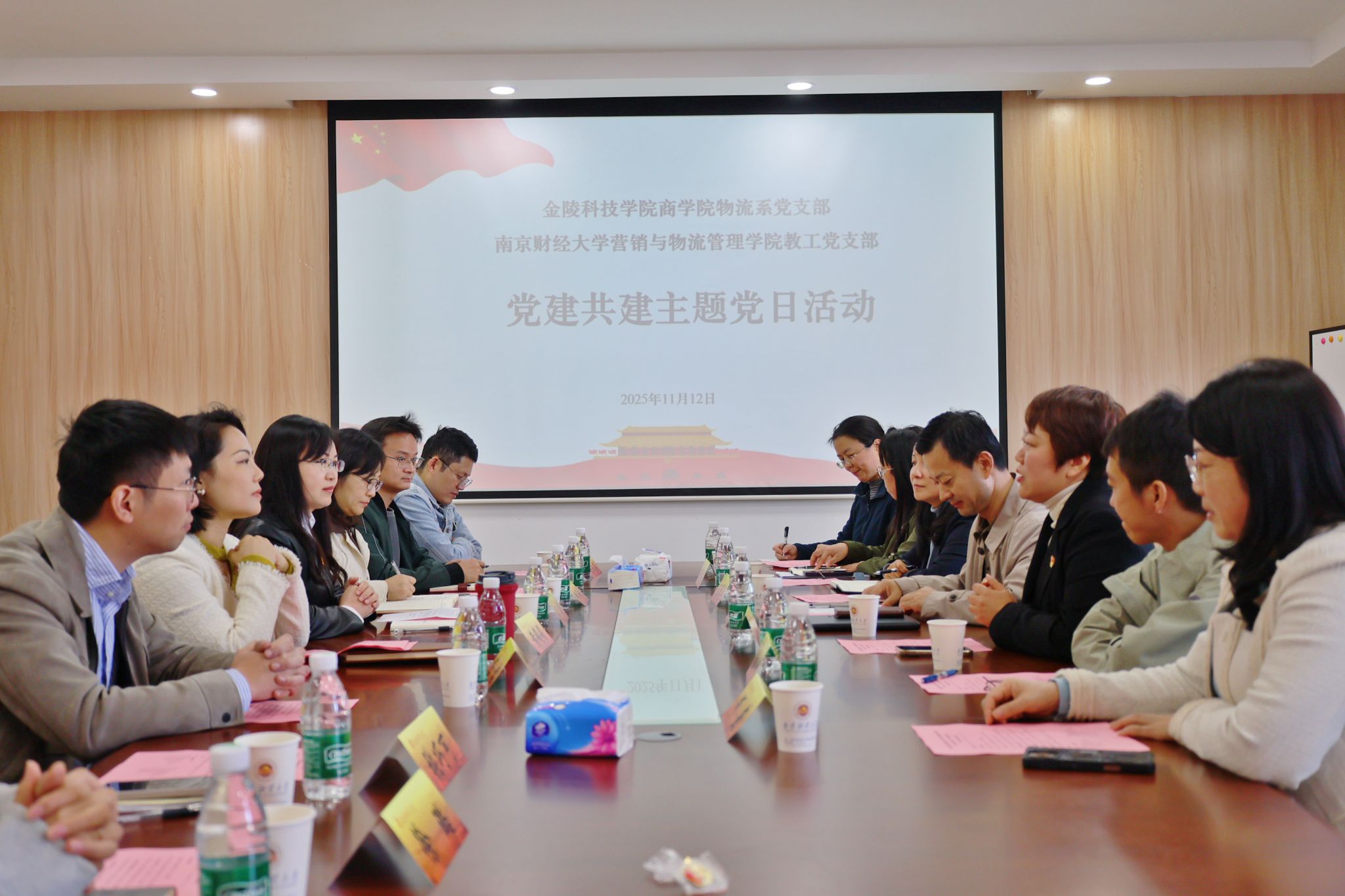 营销与物流管理学院党委刘颖书记围绕学院发展历程、学科建设及党建特色做法作专题介绍;金陵科技学院商学院徐立岗书记重点分享了物流系党支部党建与教学科研深度融合的创新经验。双方均表达了长期共建、协同发展的强烈意愿。