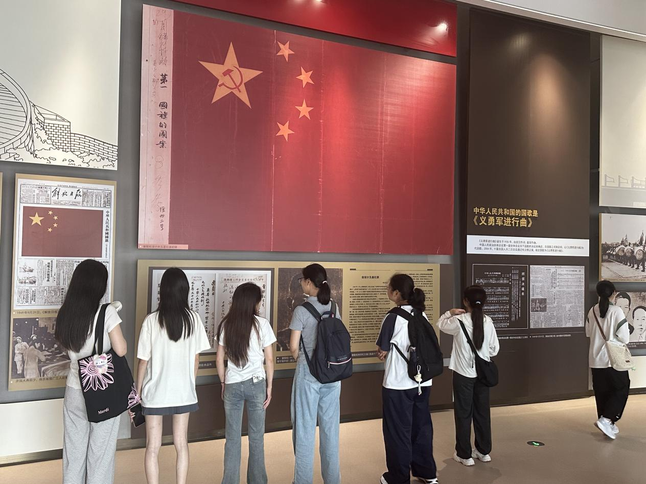 步入国旗、国歌、国徽设计的历史展区,同学们不禁肃穆,认真研读相关文献史料,从“第一国旗的图案”等珍贵展示中,深刻理解其中蕴含的法治与国家文明传承意义。