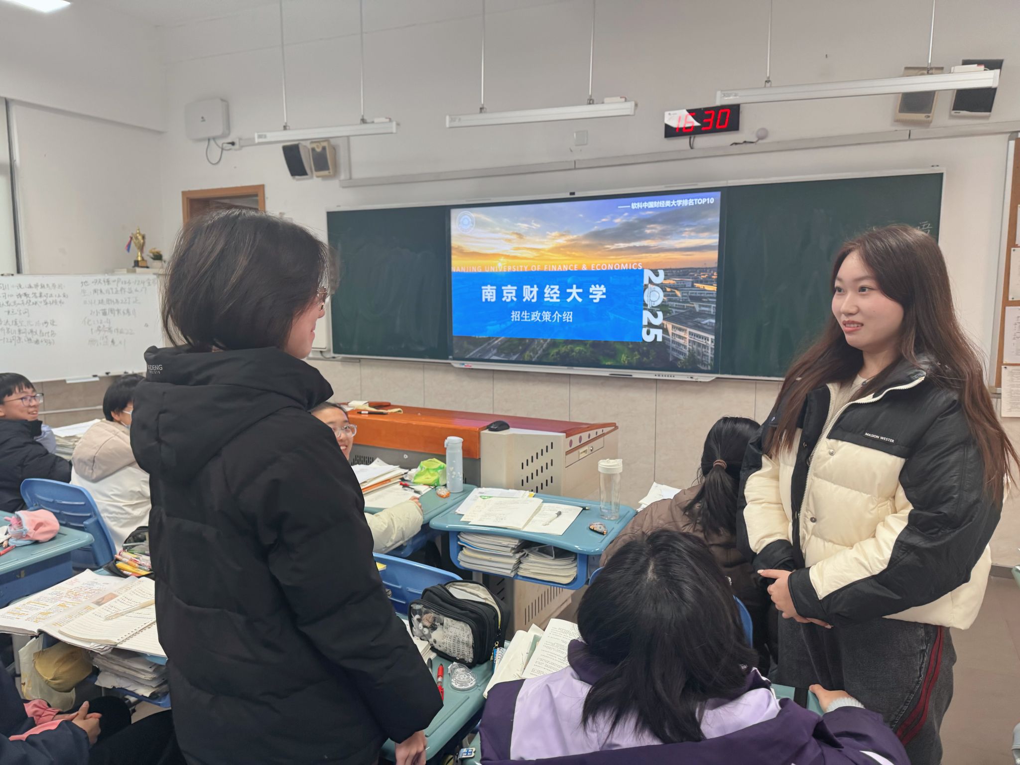 12月5日下午,南京财经大学营销与物流管理学院广告学专业2022级学生刘姝均怀着对母校的深深眷恋,重返高中母校江苏省昆山中学。她不仅宣讲了南京财经大学招生政策,还与学弟学妹热情分享了丰富多彩的大学生活、专业选择的经验与个人成长感悟,为同学们紧张的高中学习注入了一股清新的活力。