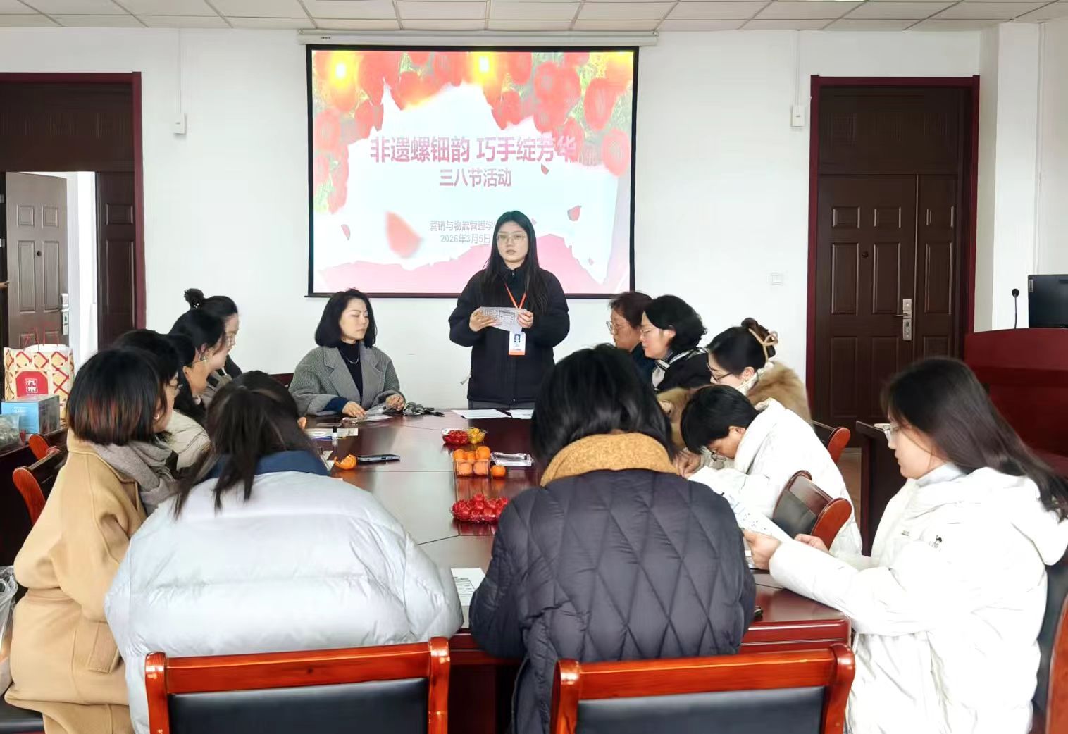 为庆祝第116个“三八”国际劳动妇女节,丰富女职工精神文化生活,传承弘扬中华优秀传统文化,3月5日下午,营销与物流管理学院在德业楼407会议室开展“非遗螺钿韵·巧手绽芳华”主题活动,学院女职工参加了活动。