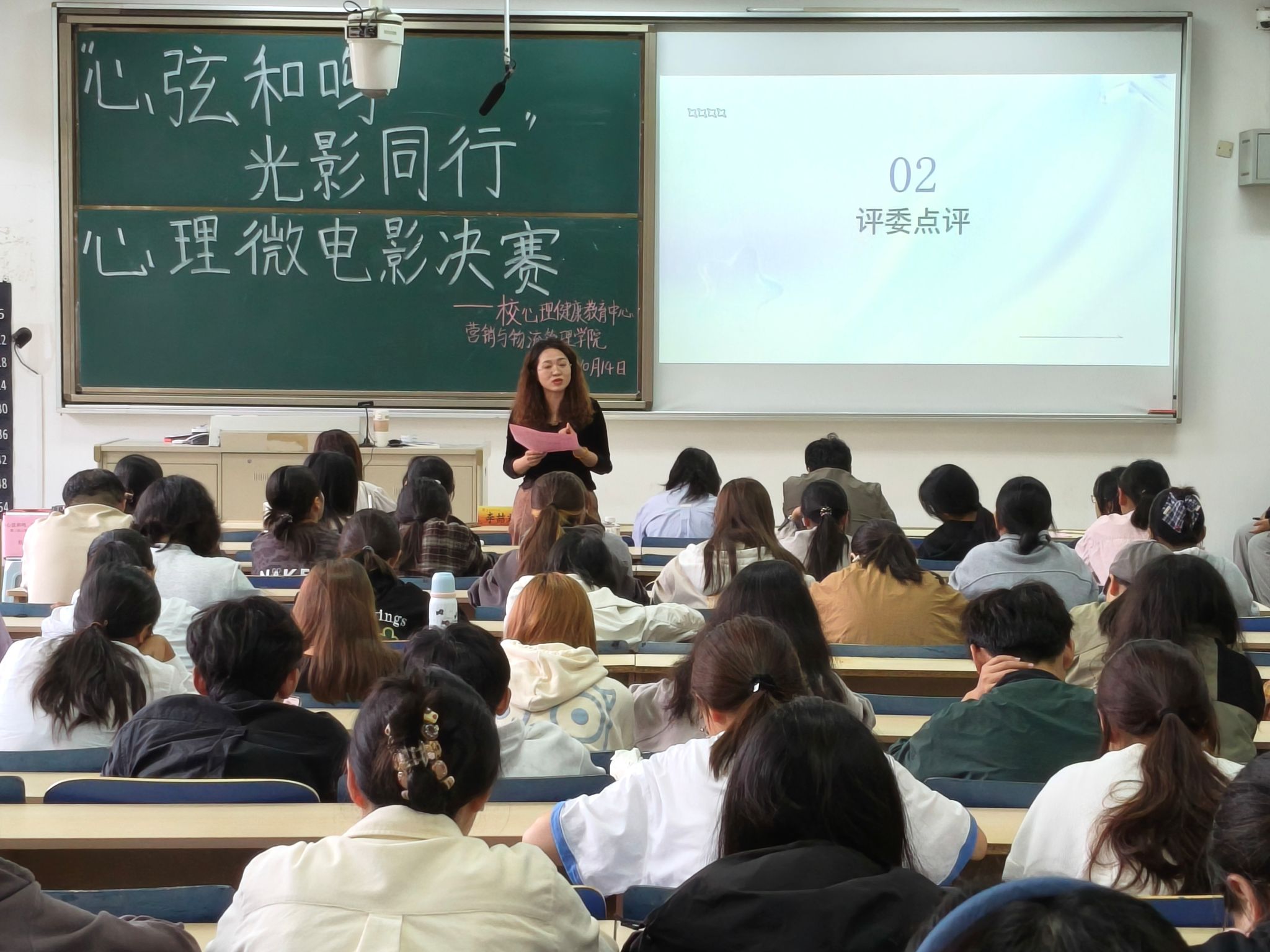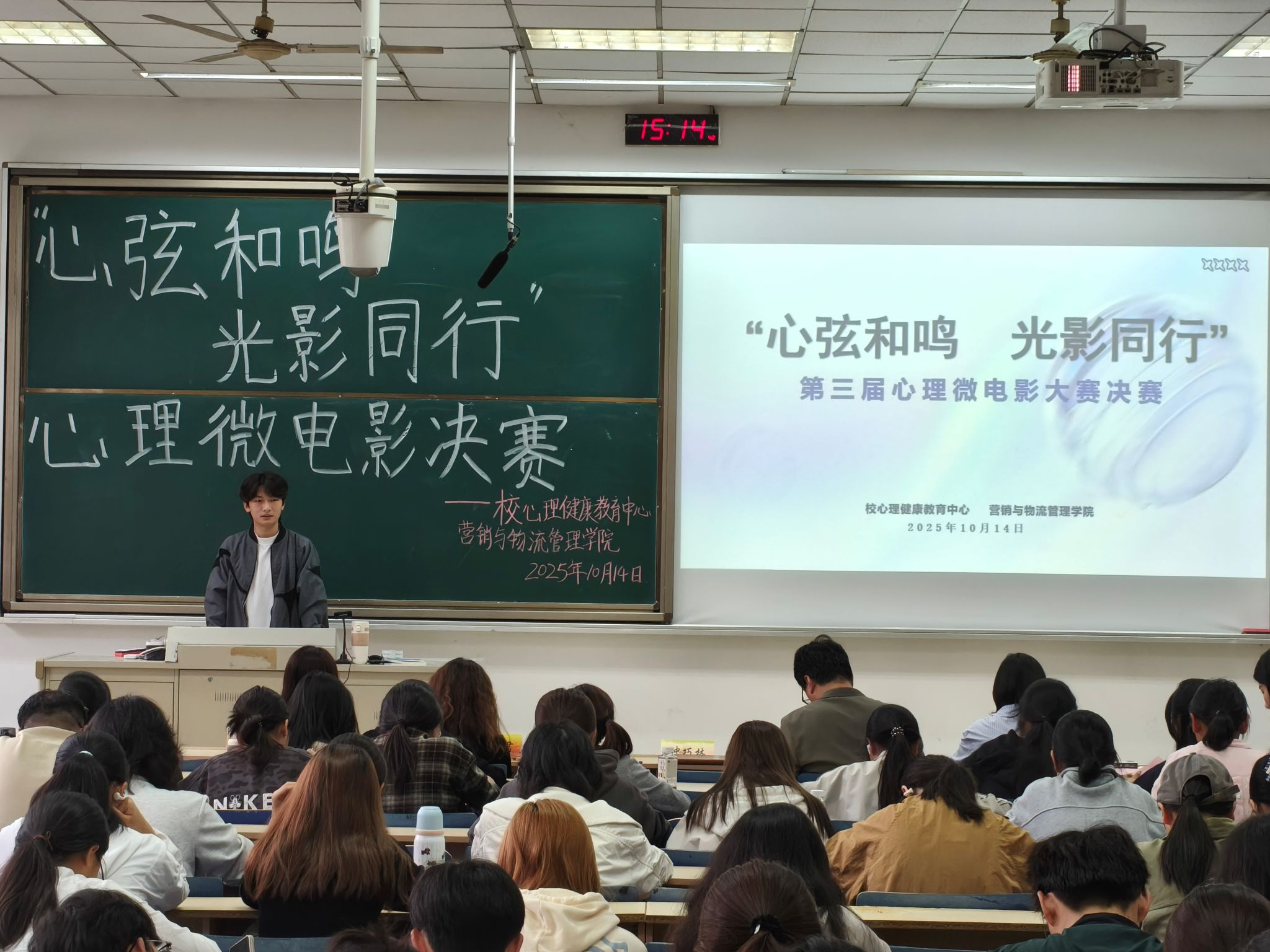 10月14日下午,由校心理健康教育中心主办、营销与物流管理学院承办的“心弦和鸣,光影同行”第三届心理微电影心理微电影大赛决赛在德正楼103举行,并在德正楼111设分会场。决赛邀请校心理健康教育中心李喆君、李浩琨,营销与物流管理学院党委副书记仲巧林、心理辅导员徐璐、辅导员孙绪华担任评委。入围决赛的团队主创人员以及全校的220名学生大众评审参加活动。